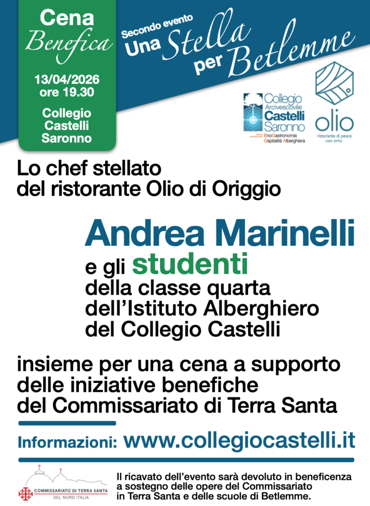 In questa seconda occasione i nostri allievi del IV anno avranno il piacere di cucinare con lo Chef Stellato Andrea Marinelli del Ristorante Olio di Origgio. Una cena stellata il cui ricavato sarà devoluto al Commissariato in Terra Santa che gestisce le scuole Cattoliche di Betlemme. Una gustosa opportunità che consente di fare del bene agli allievi che vivono in un contesto di instabilità e di conflitto.